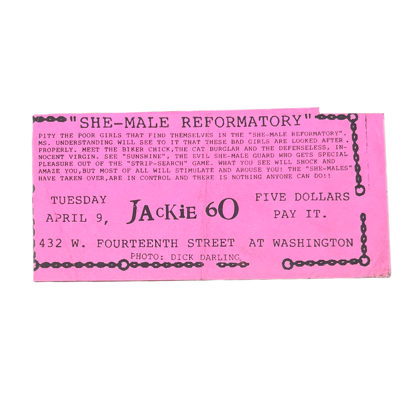 Sold OutVintage Jackie 60 NYC "She-Male Reformatory" Flyer Invite