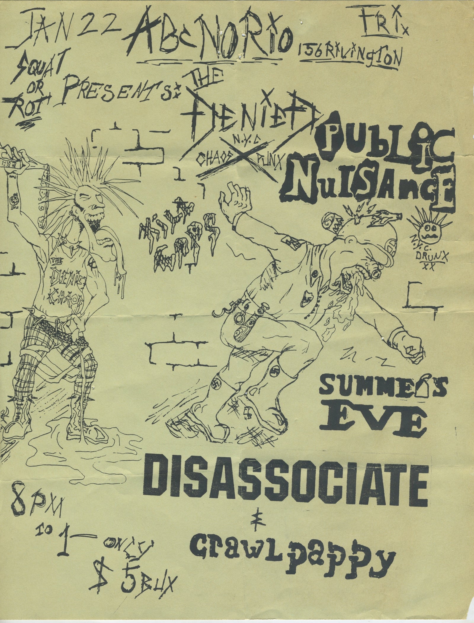 $124.99 USDVintage The Denied Public Nuisance Summer's Eve Disassociate Crawlpappy "Squat Or Rot" ABC No Rio Show Flyer