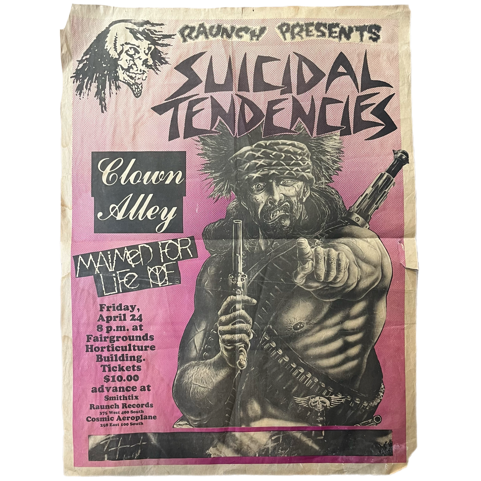 Sold OutVintage Suicidal Tendencies "Raunch Presents" Clown Alley Maimed For Life 3-Sided Screened Poster