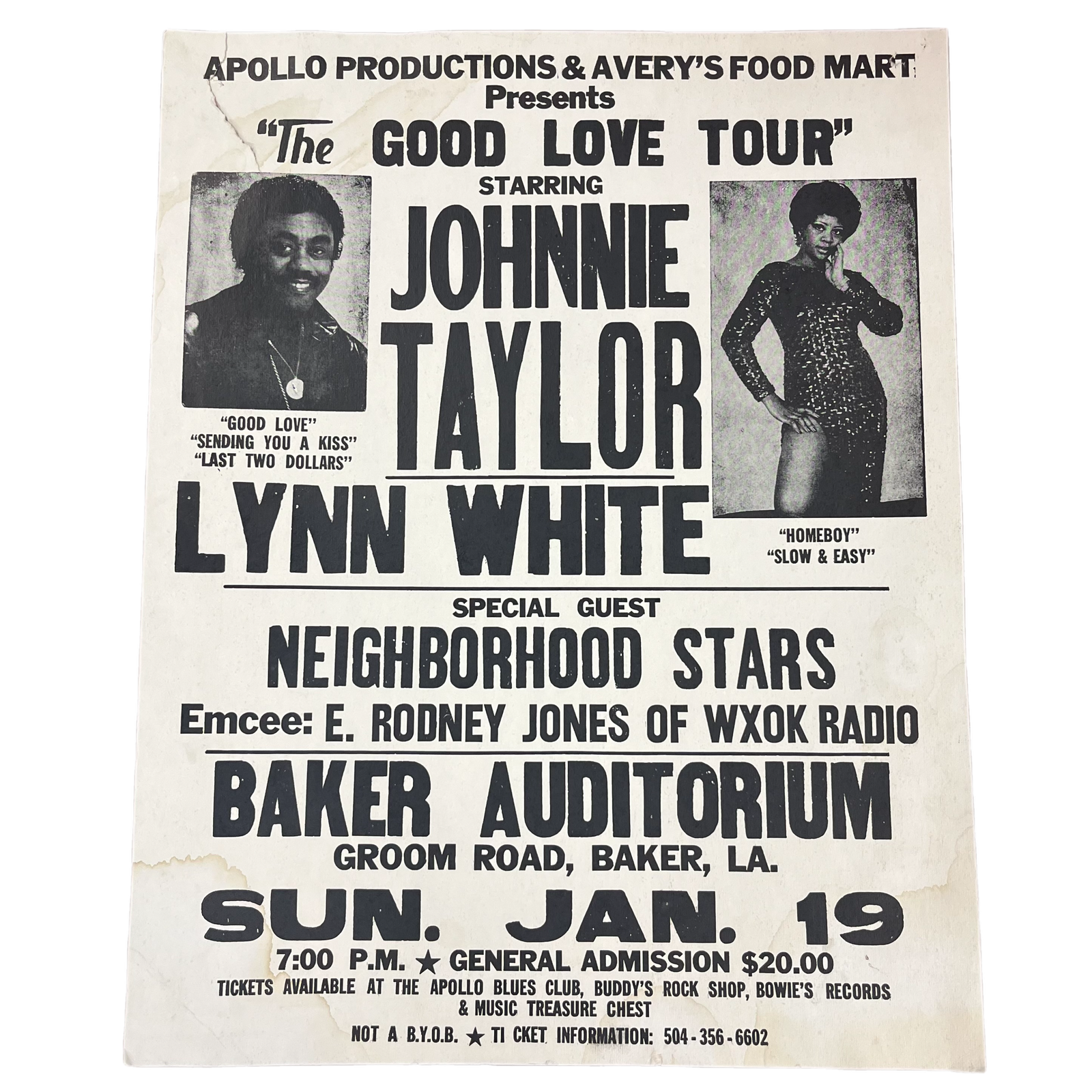 $49.99 USDVintage Apollo Productions & Avery's Food Mart Presents Johnnie Taylor Lynn White E. Rodney Jones "Baker Auditorium" Show Poster