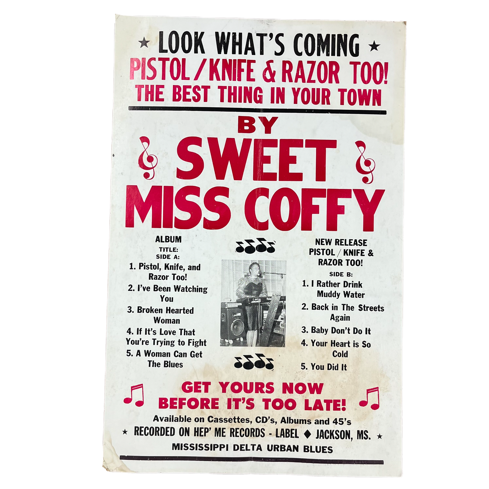 $49.99 USDVintage Sweet Miss Coffy "Pistol/Knife & Razor Too!" Hep' Me Records Promotional Poster