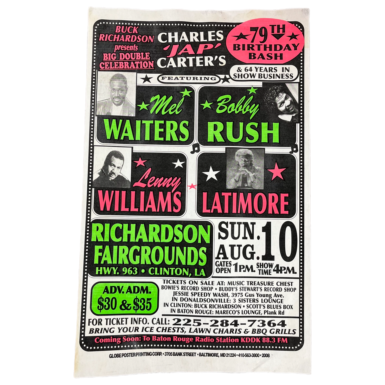 Vintage Buck Richardson Presents Charlie Jap Carter's 79th Birthday Bash Mel Waiters Bobby Rush Lenny Williams Latimore "Globe Poster Printing Corp" Show Poster