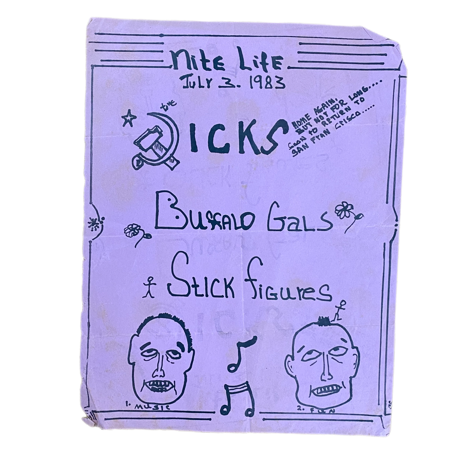 $54.99 USDVintage Dicks "Nite Life July 3, 1983" Buffalo Gals Stick Figures Flyer