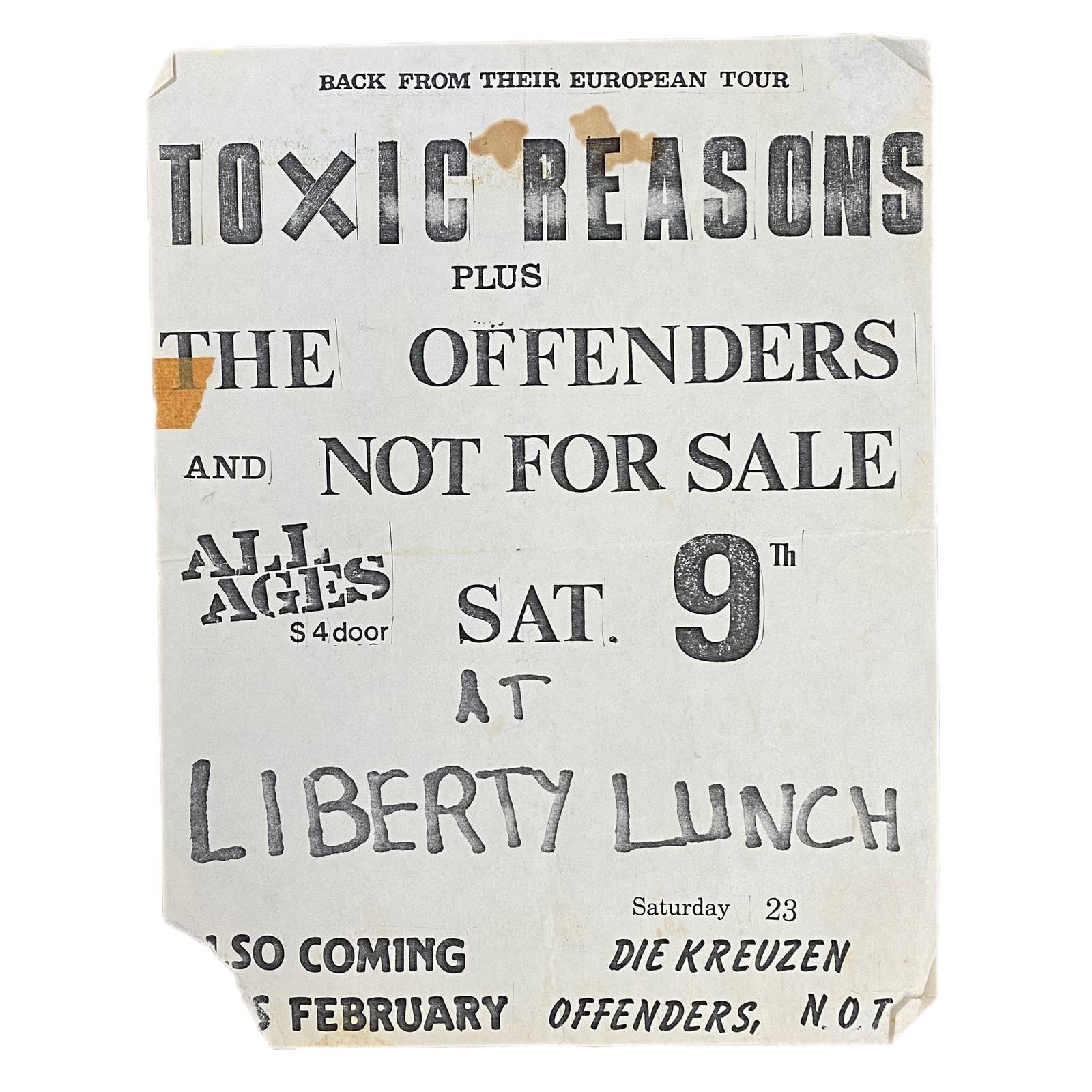$49.99 USDVintage Toxic Reasons "Liberty Lunch" Offenders Not For Sale Flyer