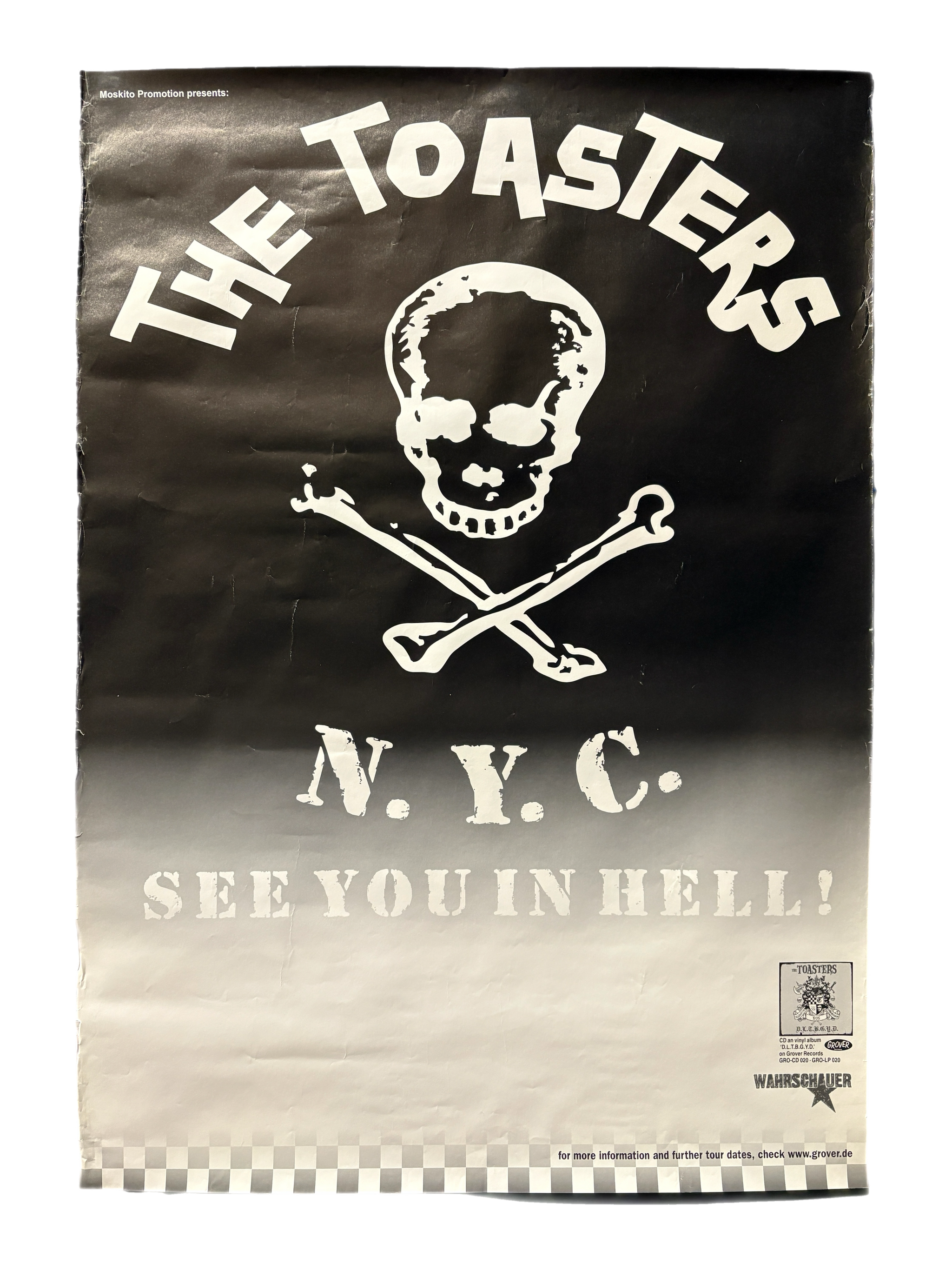Original The Toasters poster from the era of their 1997 album Don't Let The Bastards Grind You Down. Printed on glossy poster paper with some creasing and tearing visible at the edges.