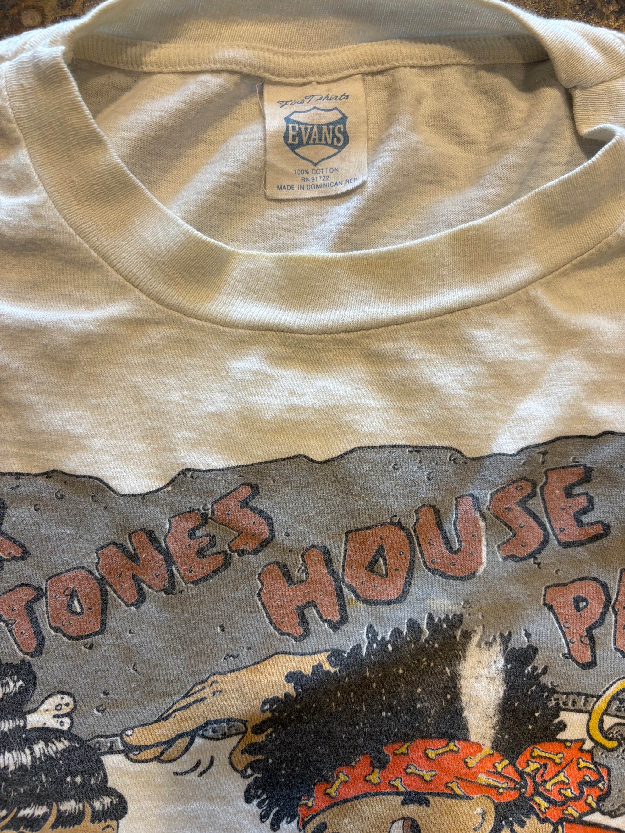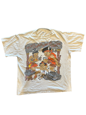 The Flintstones was a cartoon that ran from 1960 to 1966, an incredibly succesful and culturally significant show. Even now, decades later, the show is still relevant, as Fred, Wilma, Bam Bam, and Pebbles are still ubiqitous. So much so that fans in the 1990s made parody shirts, including this design for the "Blackstones." This pre-historic crew is hanging out at their own house party, dancing around a rock boombox and enjoying some nice food and drink. This vintage Blackstones parody shirt, with some damage to the print visible and yelloing as well some light pilling, is printed by Artmin Inc.