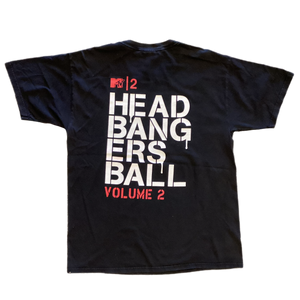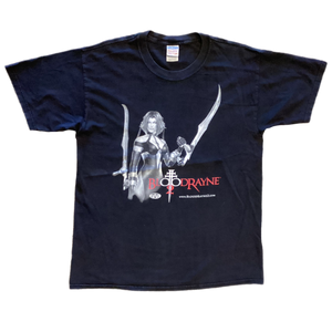 BloodRayne 2 is a video game. It was released in 2004 and created by Terminal Reality, the second installment in the series they started in 2002. The game continues the story started in the debut, a crew of human/vampire hybrids fighting to save all of mankind. It was a well-loved game, so much so that it was reissued in 2020 and 2021. This original BloodRayne 2 shirt, with a Headbangers Ball back print, is nicely worn and lightly faded.