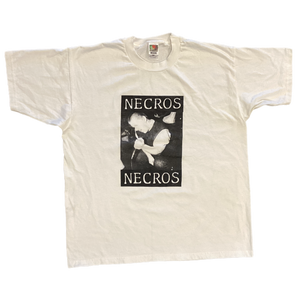 Necros were a hardcore band formed in 1979 in Maumee, OH, right south of Toledo and just a short trip away from Detroit. Alongside bands like Negative Approach, The Fix, and The Meatmen, Necros were instrumental in putting the midwest on the hardcore map and documenting it via their Touch & Go Records. As the band continued, they released weirder and weirder stuff, but a lot of people prefer the early stuff, the genre-defying hardcore 7"s and such. This vintage Necros shirt from the 1990s, in deadstock condition with a few light marks from prolonged storage, features an early live shot of the band.