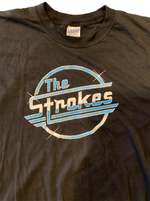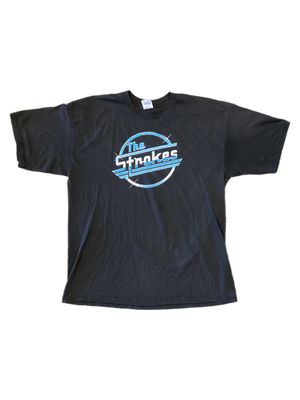 The Strokes formed in 1998 in New York City. The indie band took two years to just practice and get things right, and by 2001, they were ready to record their debut EP. They sent the record to Rough Trade who quickly agreed to put out the three songs, "The Modern Age," "Last Nite," and "Barely Legal." Almost instantly, the record set off a bidding war which ended in the Strokes signing to RCA and releasing Is This It?, the Platinum-certified, era-defining album. This original The Strokes shirt from the early 2000s features their instantly recognizable logo based off the Magna cigarettes logo.