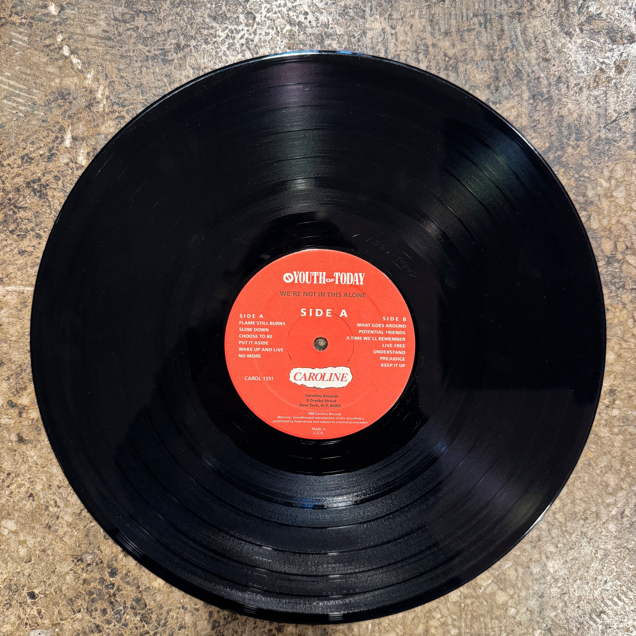 This is Youth Of Today's second and final LP, We're Not In This Alone, on Caroline Records. This copy, which is still in shrink with a "Made In U S A" sticker on the back cover, is the rare first mix.